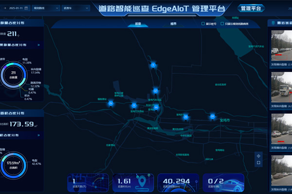 将边缘计算主机、摄像头、北斗定位,利用算法模型:道路病害识别、并盖异常识别、路边资产识别、城管相关识别,内置的跳车检测模块,可以实时记录路面的颠簸状况,生成跳车值数据记录,并将相关问题自动上传平台,并追踪闭环,基于大量病害数据结合平整度、跳车值智能分析生成五色图,构建多源数据融合的智能决策系统,为城市设施安全运行保驾护航。